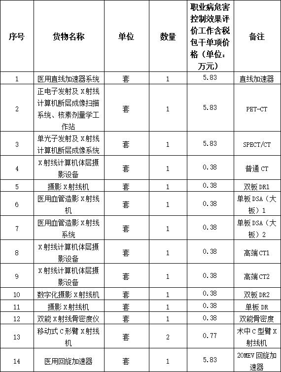 1.1.2服务内容: 绵阳三江医院项目(一期)职业病危害控制效果评价工作全部工作内容:进行现场验收检测并编制职业病危害放射防护控制效果评价工作报告书,协调市卫健部门召开职业病危害控制效果评价工作报告专家审核会议,通过专家评审,并最终取得批复。具体设备如下: