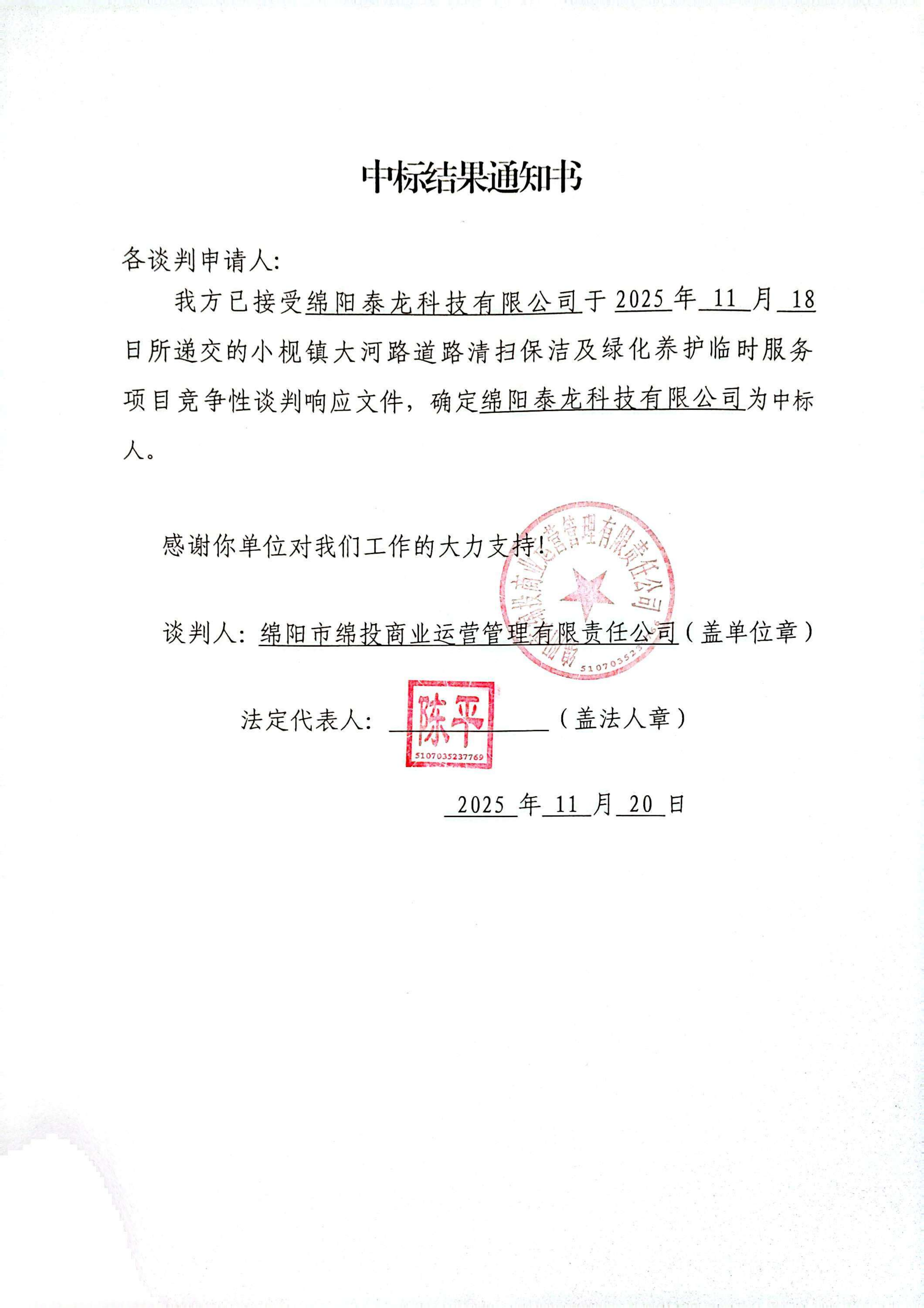 我方已接受绵阳泰龙科技有限公司于2025年 11 月 18 日所递交的小枧镇大河路道路清扫保洁及绿化养护临时服务项目竞争性谈判响应文件,确定绵阳泰龙科技有限公司为中标人。