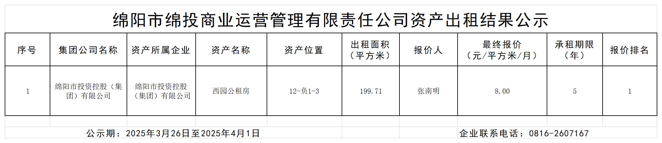 绵阳市william威廉英国官网商业运营管理有限责任公司资产出租结果的公示