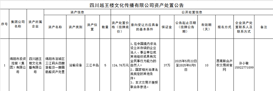 四川越王楼文化传播有限公司资产处置公告