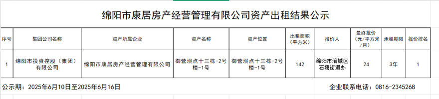 绵阳市康居房产经营管理有限公司资产出租结果公示