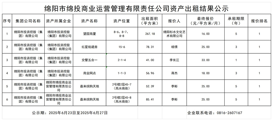 绵阳市william威廉英国官网商业运营管理有限责任公司资产出租结果公示