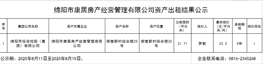 绵阳市康居房产经营管理有限公司资产出租结果公示