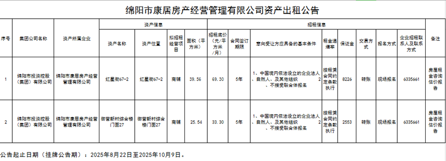 绵阳市康居房产经营管理有限公司资产出租公告