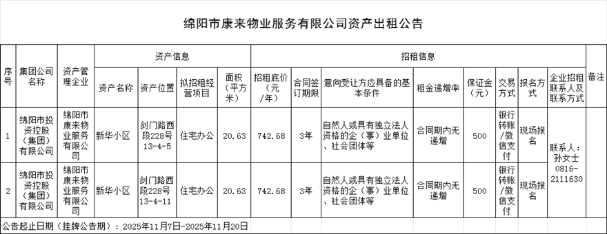 绵阳市康来物业服务有限公司资产出租公告
