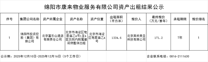 绵阳市康来物业服务有限公司资产出租结果公示