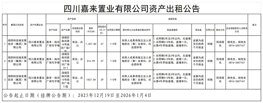四川嘉来置业有限公司资产出粗公告