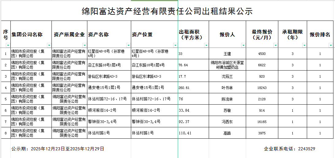 绵阳富达资产经营有限责任公司出租结果公示