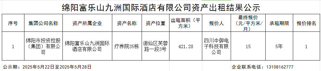 绵阳富乐山九洲国际酒店有限公司资产出租结果公示