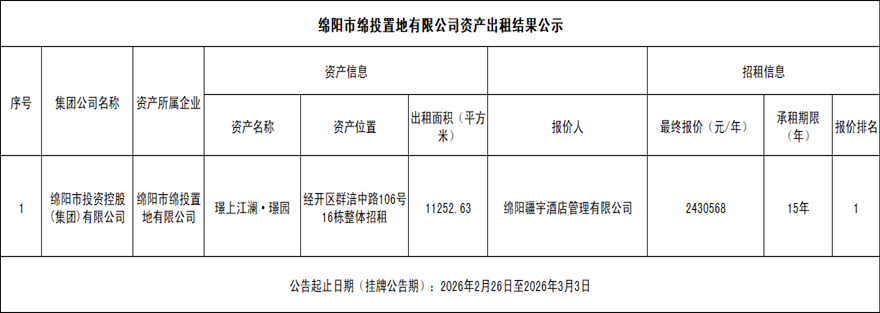 绵阳市william威廉英国官网置地有限公司资产出租结果公示