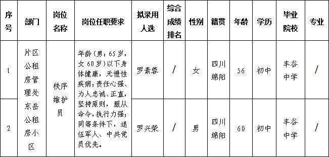 根据康居公司发布的长期招聘一线勤杂人员的招聘公告相关规定,经面试、体检等程序,拟录用罗素蓉、罗兴荣同志到绵阳市康居房产经营管理有限公司片区公租房管理处东岳公租房小区工作,现予以公示,具体情况如下: