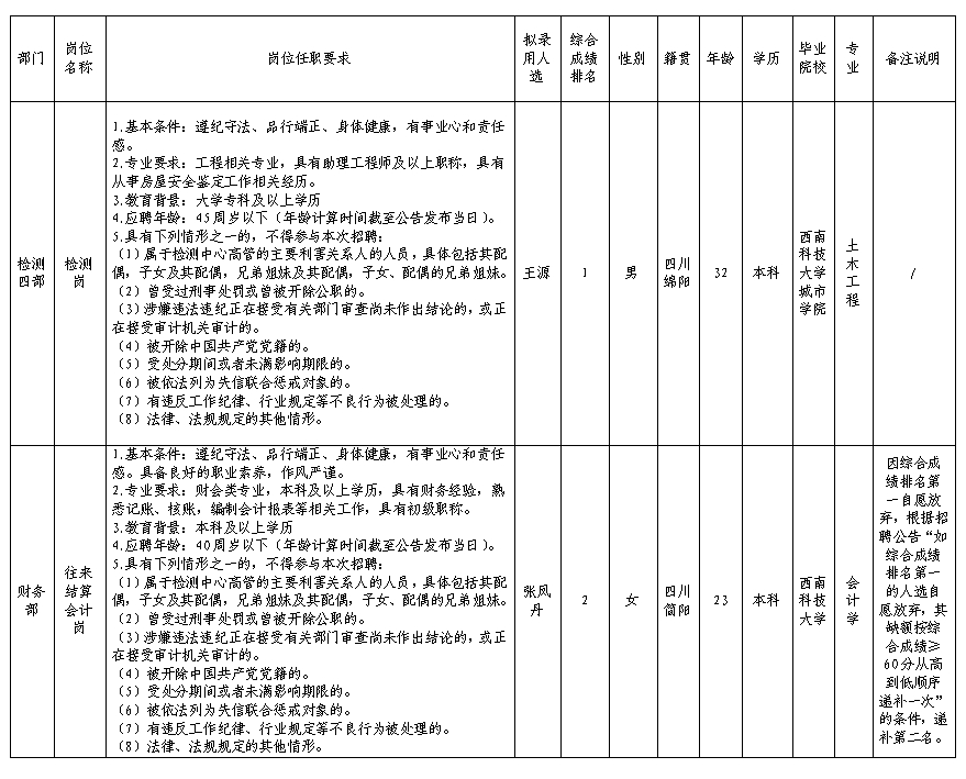 根据绵阳市建设工程质量检测中心有限责任公司发布的招聘公告及招聘相关规定,经笔试、面试、背景调查、体检等程序,拟录用王源等同志到绵阳市建设工程质量检测中心有限责任公司工作,现予以公示,具体情况如下: