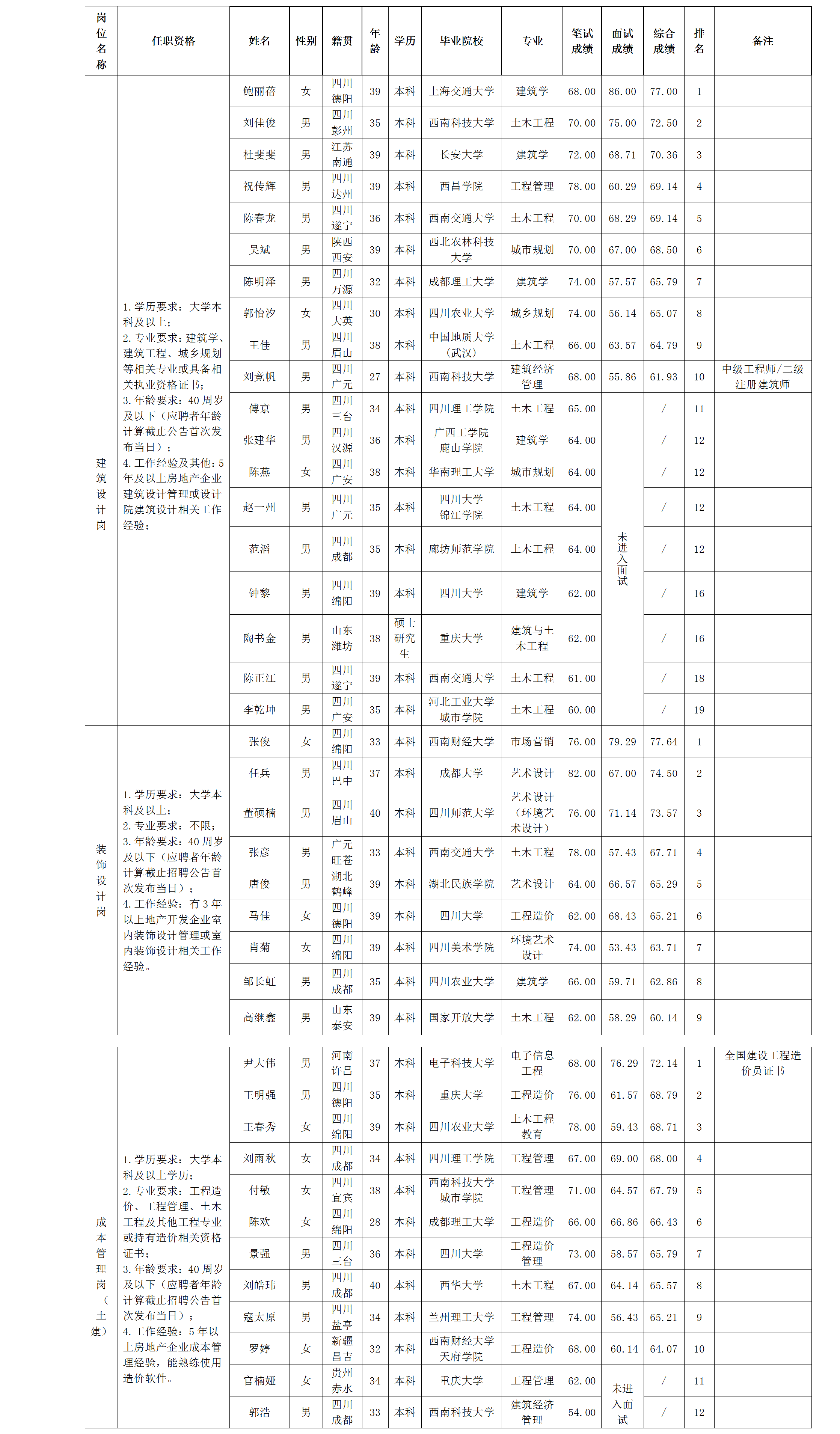 根据绵阳市william威廉英国官网置地有限公司发布的招聘公告及招聘相关规定,经笔试、面试等程序,现将笔试、面试成绩予以公示。