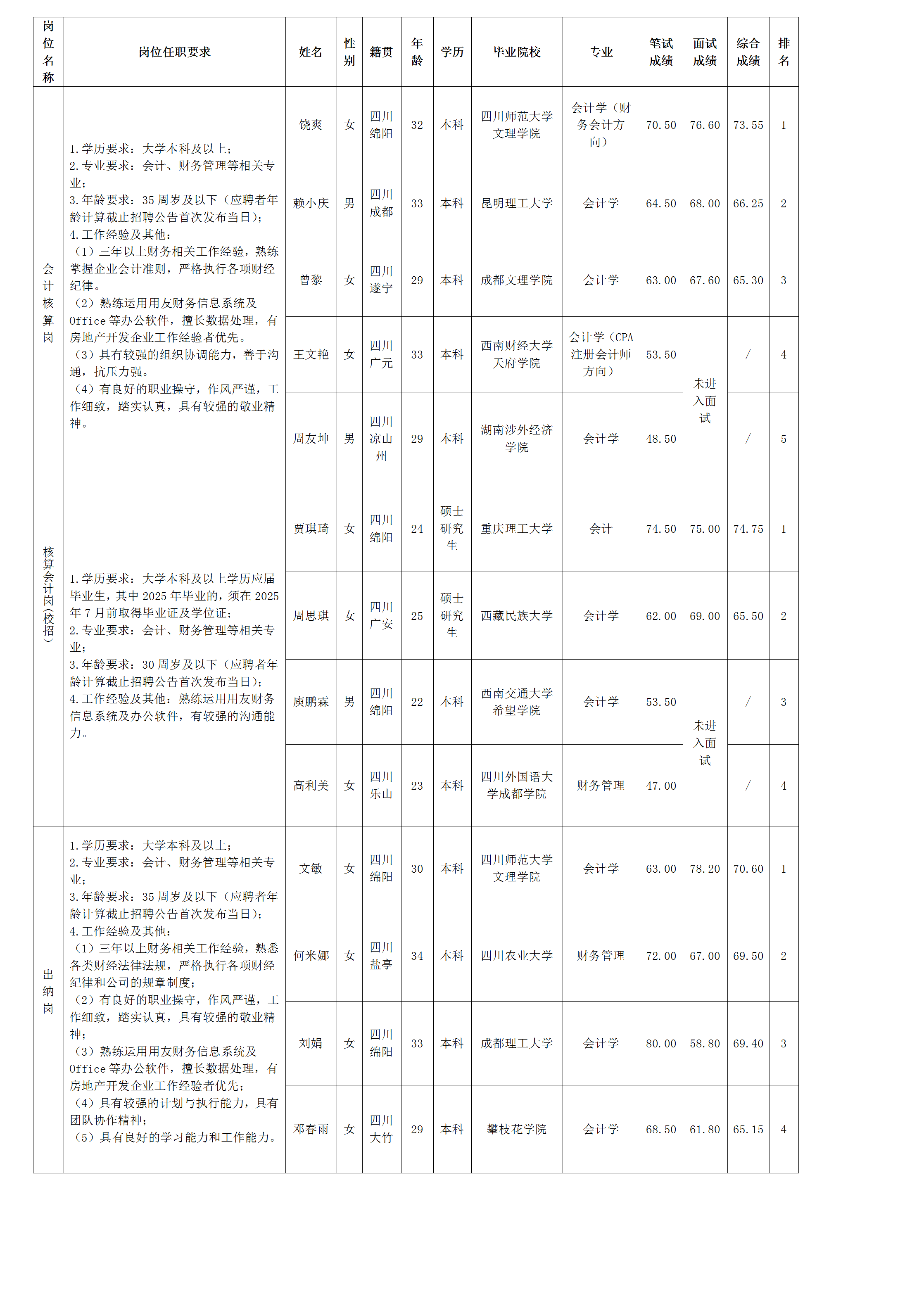 根据绵阳市william威廉英国官网置地有限公司发布的招聘公告及招聘相关规定,经笔试、面试等程序,现将笔试、面试成绩予以公示。