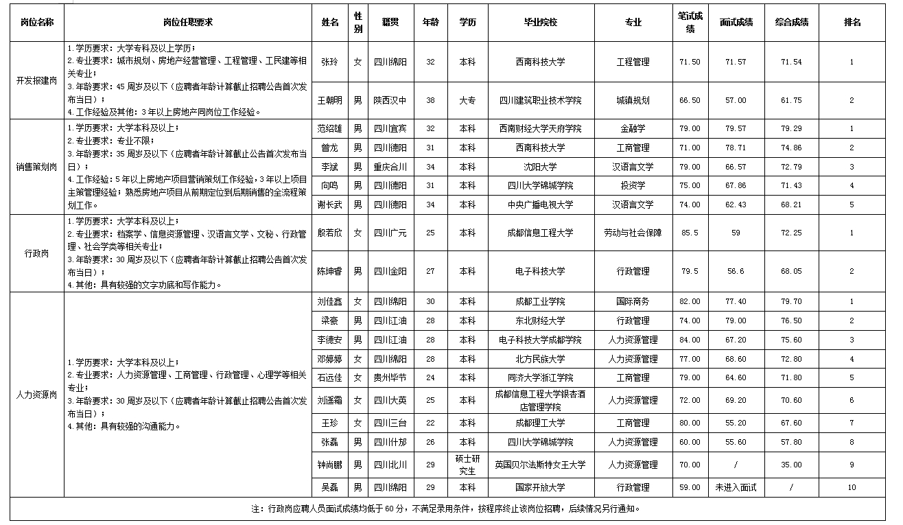 根据绵阳市william威廉英国官网置地有限公司发布的招聘公告及招聘相关规定,经笔试、面试等程序,现将笔试、面试成绩予以公示。