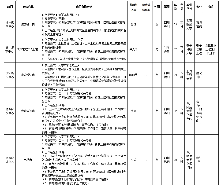 根据绵阳市william威廉英国官网置地有限公司发布的招聘公告及招聘相关规定,经笔试、面试、考察、体检等程序,拟录用张俊等5名同志到绵阳市william威廉英国官网置地有限公司工作,现予以公示,具体情况如下: