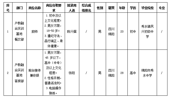 根据绵阳市绵州嘉来会务服务有限公司发布的招聘公告及招聘相关规定,经面试、体检等程序,拟录用陈兴熠、张阳同志到产教融合实训基地餐饮部、客房部工作,现予以公示,具体情况如下: