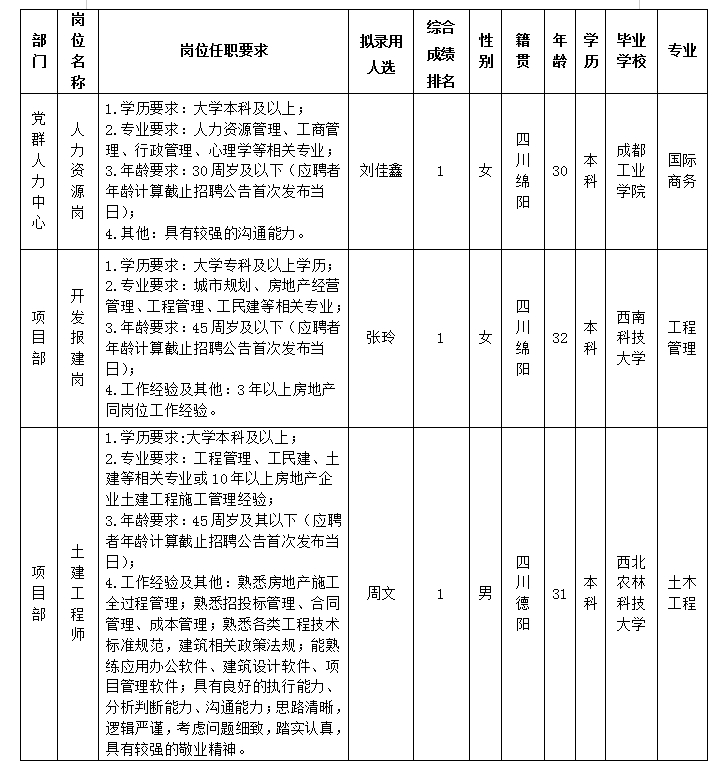 根据绵阳市william威廉英国官网置地有限公司发布的招聘公告及招聘相关规定,经笔试、面试、考察、体检等程序,拟录用刘佳鑫等3名同志到绵阳市william威廉英国官网置地有限公司工作,现予以公示,具体情况如下: