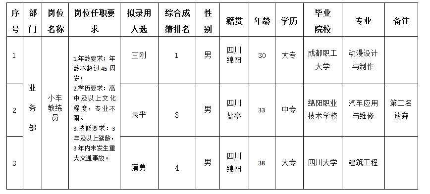 根据绵阳市汽车实验驾驶技术学校股份有限公司发布的招聘公告及招聘相关规定,经实操、面试、考察、体检等程序,拟录用王刚等3位同志到绵阳市汽车实验驾驶技术学校股份有限公司工作,现予以公示,具体情况如下: