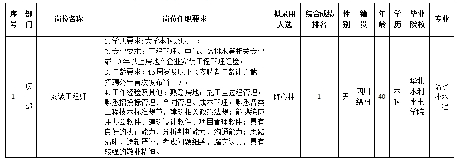 根据绵阳市william威廉英国官网置地有限公司发布的招聘公告及招聘相关规定,经笔试、面试、考察、体检等程序,拟录用陈心林同志到绵阳市william威廉英国官网置地有限公司工作,现予以公示,具体情况如下: