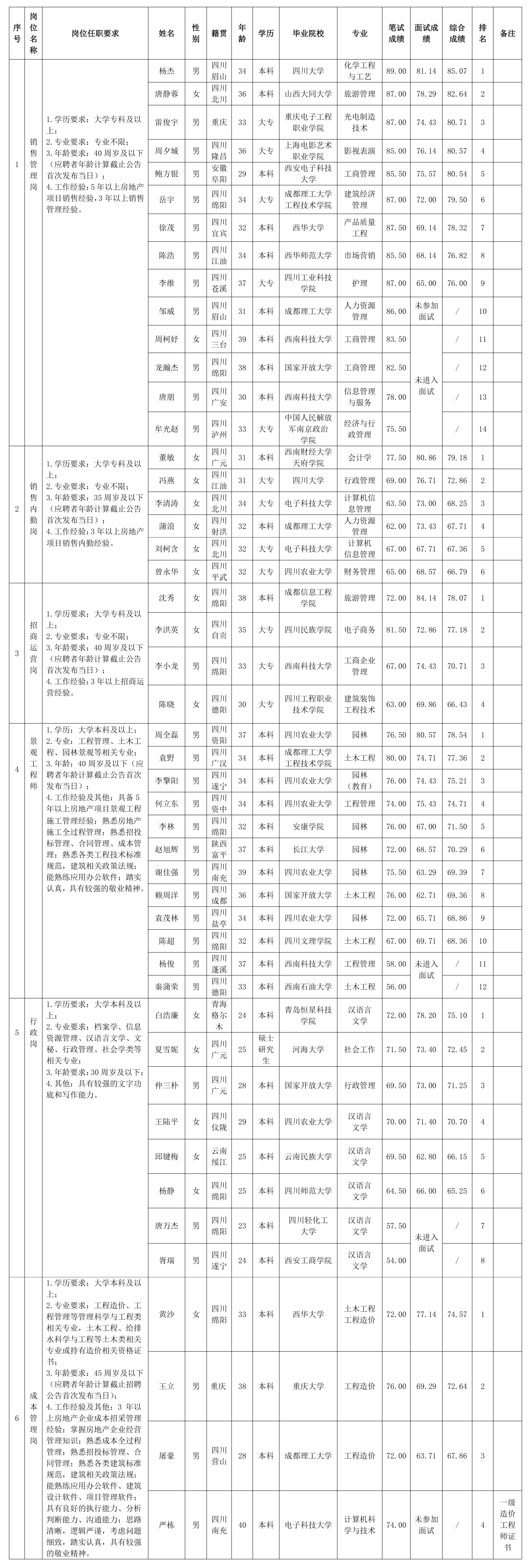 根据绵阳市william威廉英国官网置地有限公司发布的招聘公告及招聘相关规定,经笔试、面试等程序,现将笔试、面试成绩予以公示。