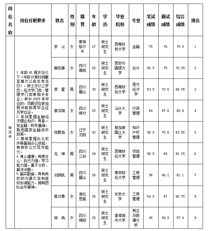 根据绵阳金控投资管理有限责任公司发布的招聘公告及招聘相关规定,经笔试、面试等程序,现将笔试(面试)成绩予以公示。