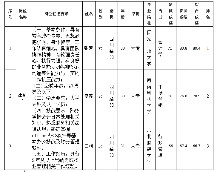 根据绵阳市康来物业服务有限公司发布的选聘公告及选聘相关规定,经笔试、面试等程序,现将笔试(面试)成绩予以公示。