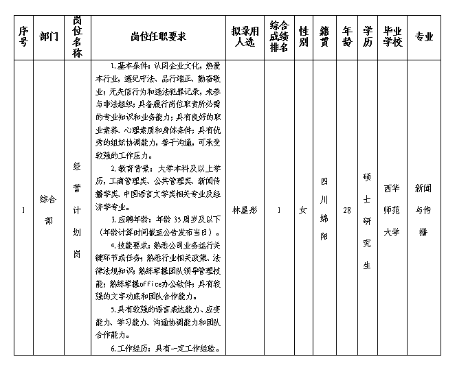 根据绵阳市城市停车管理有限公司发布的招聘公告及招聘相关规定,经笔试、面试、背调、体检等程序,拟录用林星彤到绵阳市城市停车管理有限公司工作,现予以公示,具体情况如下: