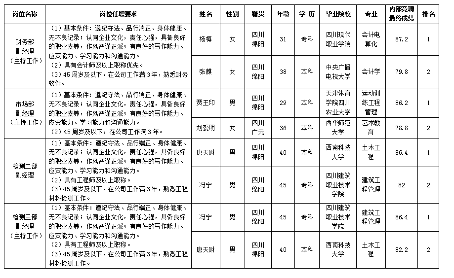 根据绵阳市建设工程质量检测中心有限责任公司发布的内部竞聘公告及相关规定,现将竞聘最终成绩予以公示。