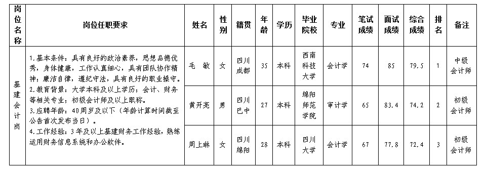 根据富达公司发布的招聘公告及招聘相关规定,经笔试、面试程序,现将成绩予以公示。