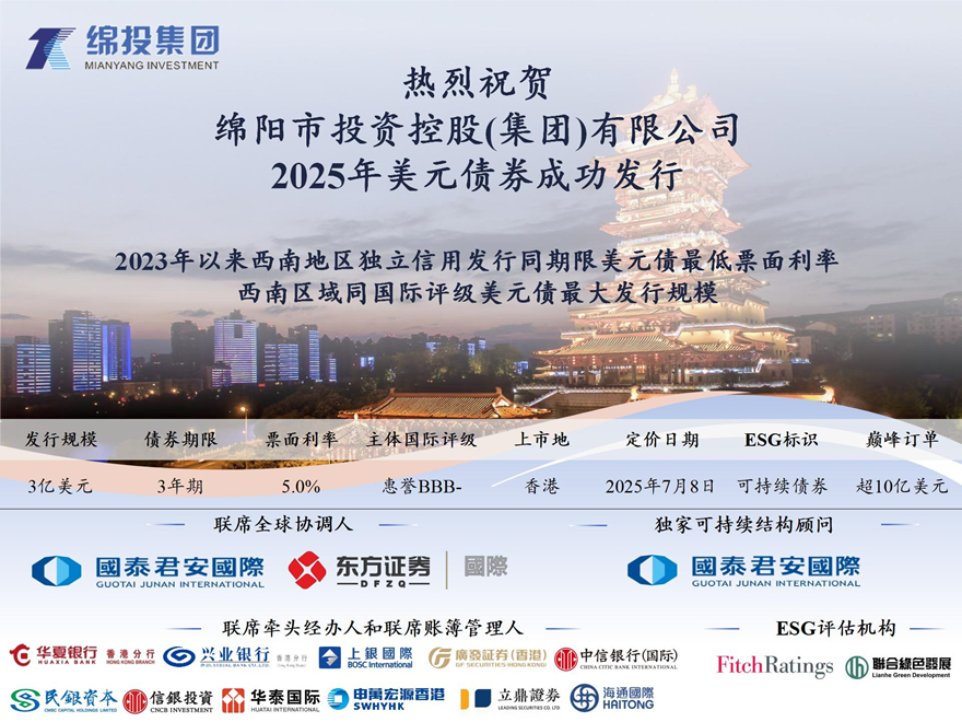 7月8日,william威廉英国官网集团成功定价发行3亿美元、3年期可持续美元债券,认购倍数3.43倍(峰值订单超10亿美元),最终票面利率强势锁定5.00%,较初始价格指引大幅收窄70个基点,创2023年以来西南地区独立信用发行同期限境外美元债最低票面利率、西南区域同国际评级美元债最大发行规模,以及创2025年以来中资投资级地方国企美元债最大收窄幅度。