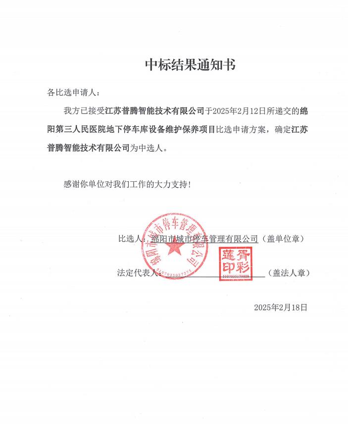绵阳第三人民医院地下停车库设备维护保养项目中标结果通知书