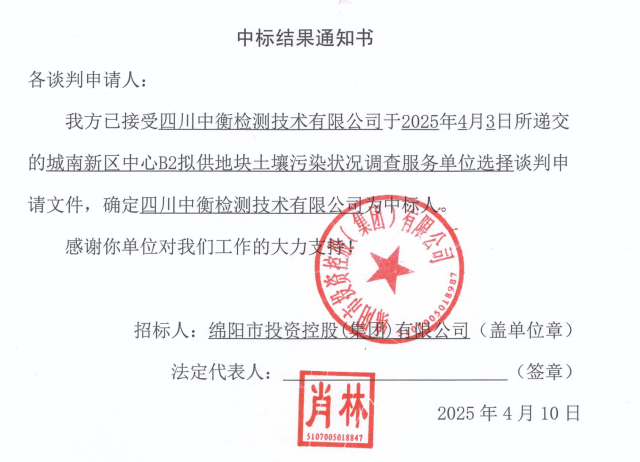 城南新区中心B2拟供地块土壤污染状况调查服务单位选择中标结果通知书