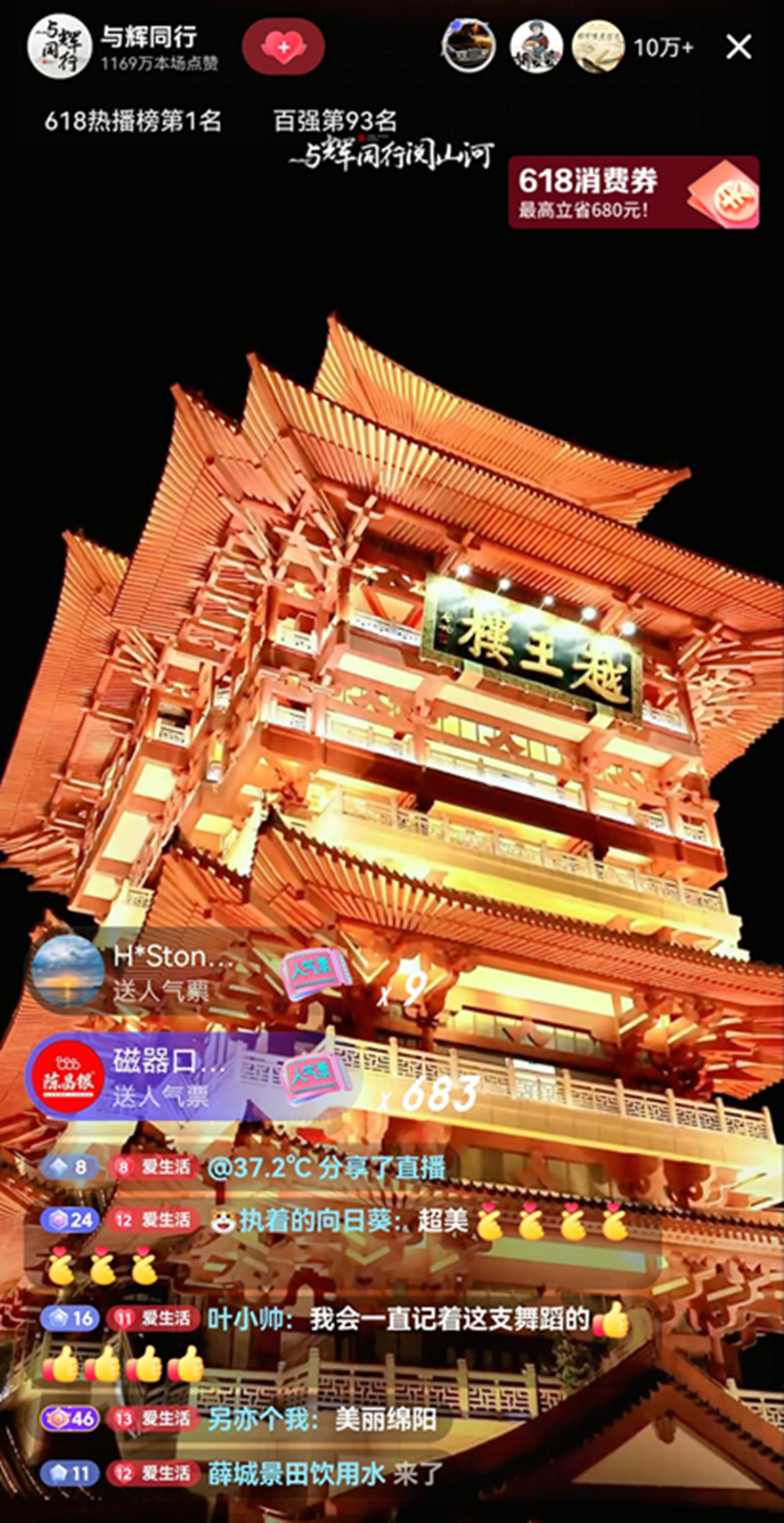 直播活动中,董宇辉结合越王楼建筑细节的实景展示,两度吟诵《上楼诗》,向观众展示越王楼“不敢高声语,恐惊天上人”的巍峨壮阔,将越王楼的历史底蕴与诗歌魅力以沉浸式方式呈现给全国观众。他感叹:“下次在街头再相遇的时候,请问故人从何处而来,想必他们都是被越王楼吸引而来的。”